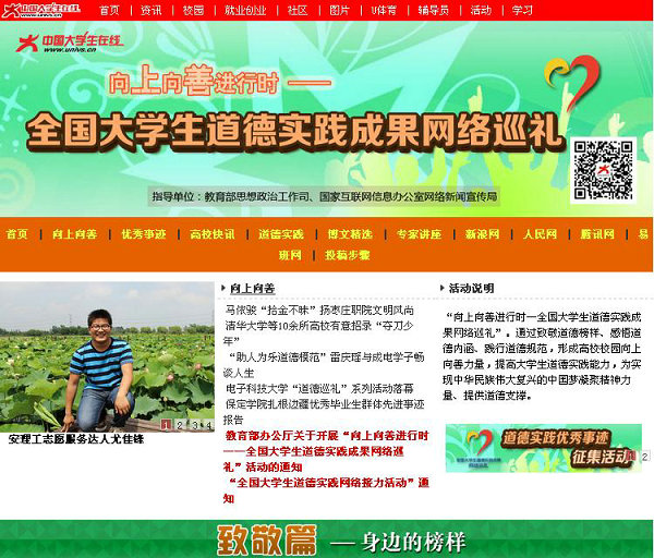“全国大学生道德实践成果网络巡礼活动”主要在“向上向善进行时”主题下,选取勤俭节约、诚实守信、助人为乐、见义勇为、自强创新、志愿奉献、敬老爱亲等角度对大学生道德进行阐释和解读,宣传高校的优秀道德事迹。访谈话题由申请高校选定,访谈嘉宾可以是高校校领导、思想道德教育与心理学等方面专家、优秀道德事迹人物。