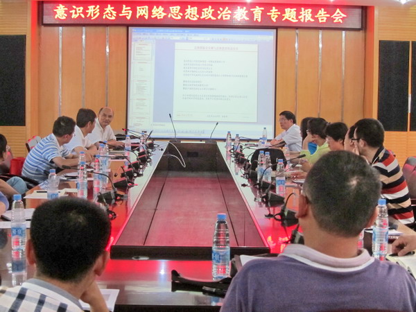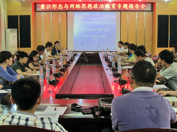 6月19日上午,由思政部主办的“意识形态与网络思想政治教育”专题报告会在校本部图北会议室举行。安徽大学博士生导师吴学琴教授、合肥工业大学硕士生导师张建设教授应邀在会上分别作了题为《意识形态安全与媒介话语》、《总体国家安全观与总体意识形态安全》的学术报告。报告会由思政部副主任孙功主持。