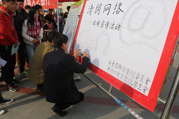 3月7日上午,能源与安全学院在北区开展“网文化之精华、络天下之精英、闻世间之正事、明做人之德行”为主题的“清朗网络·青年力量”网络文明志愿活动。校团委副书记彭晶、院党委副书记金德及院青年志愿者参加活动。
