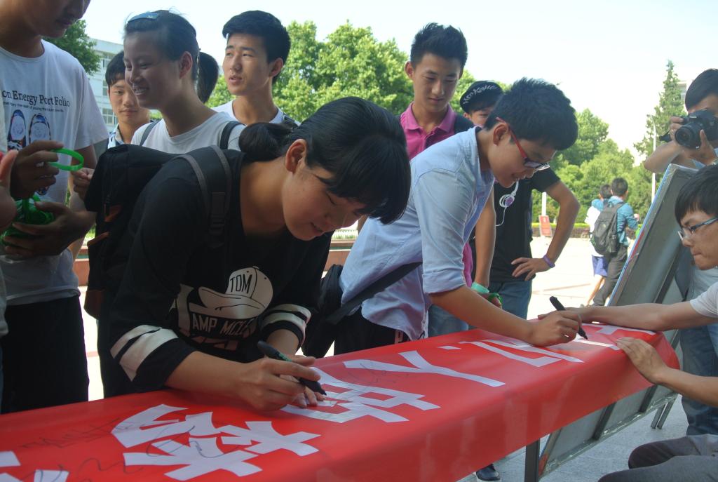 5日,大气污染防治宣传活动在北校区喷泉广场如火如荼开展。环保志愿者通过组织签名、有奖问答、播放音像资料、专题展板等多种方式向同学们普及大气污染防治知识。活动中,过往的同学郑重地在展板上写下自己的环保宣言,共同呼吁更多的人加入到环境保护的行列。志愿者们还向同学们赠发了“请随手拔掉充电器”的绿色书签和绿色手环,提醒同学们环保人人可为。