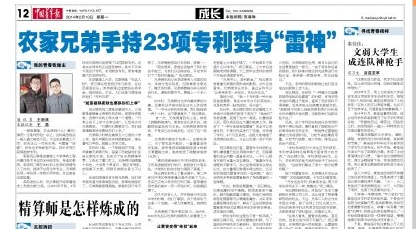 自2013年12月26日,安徽网以“宿州两兄弟同上安徽理工大学,3年获得23项国家专利”为题对我校“专利兄弟”的事迹报道后,人民网、中国知识产权咨询网、新浪网安徽新闻、中国网魅力安徽、中安在线、安青网、淮南人民政府网、淮南报业新闻网等多家媒体网站进行了转载报道,在社会上产生了很大的影响。近日,他们的事迹再度引起媒体的广泛关注,《中国青年报》于2月10日第12版头条以“农家兄弟手持23项专利变“雷神”为题,用2600字的篇幅进行了详细报道,随后,人民网、新华网、中国日报网、光明网、中国青年网、中工网、中青在线、新浪新闻、搜狐微博、网易教育、安徽日报、福建日报、浙江在线、天津网、山东网、甘肃网、云南网、吉林网等国家、省级媒体也进行转载刊登,转载次数达300条。