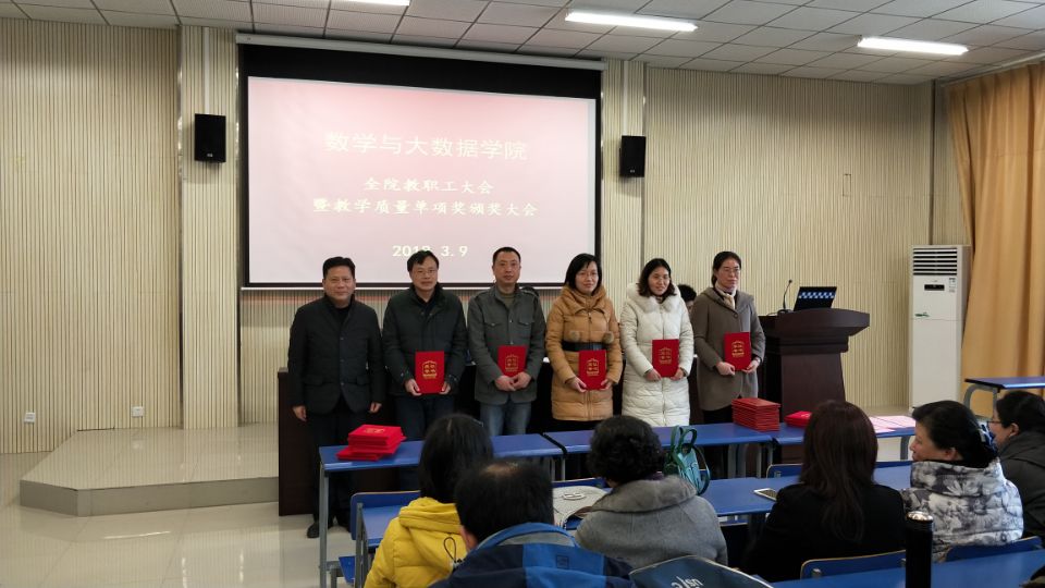3月9日下午,数学与大数据学院在学院报告厅召开全体教职工大会暨颁奖大会。教务处负责人应邀出席大会,院领导及全体教职工参加大会。会议由院党委书记赵前进主持。