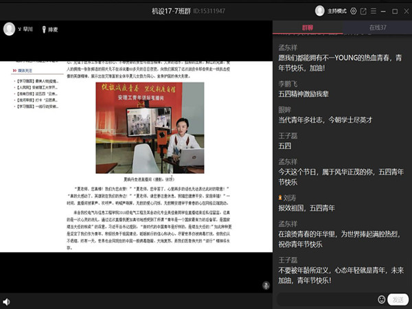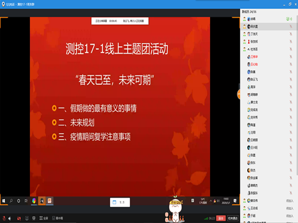 学院团员青年以“共同抗疫,爱国力行”为主题积极开展形式多样的线上主题班会,深入学习“五四精神”。机设18-10班团支部全体团员青年学习习近平总书记对新时代青年的寄语,并结合当前的防疫工作情况,发表自己对“五四精神”的认识和理解;机设17-7班团支部带领全体团员青年学习全国卫生健康系统新冠肺炎疫情防控工作先进个人、我校第一附属医院援鄂医疗队副队长夏晓丹的抗疫英雄事迹,引导青年学生敢于拼搏、勇挑重担。