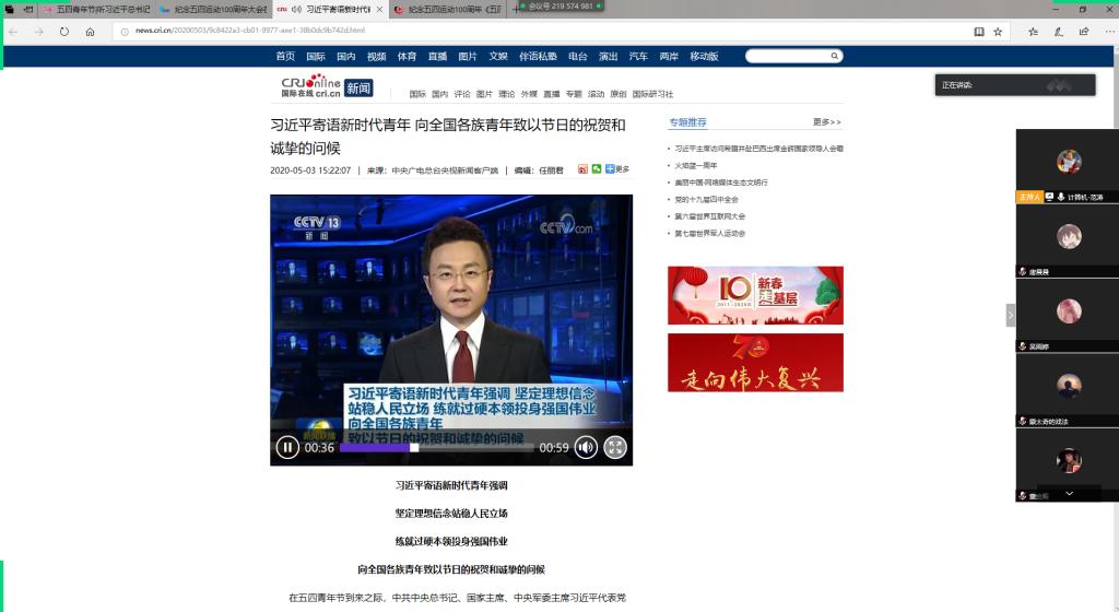 5月6日,计算机学院党委组织学生各党支部通过“腾讯会议”平台开展了“五四记忆”主题党日活动。本次活动以“五四记忆”为主题,在五四运动爆发一百零一周年的背景下,通过重温那段激情燃烧的岁月,加深对五四运动历史意义和时代价值的认识,各支部全体党员参加了活动。