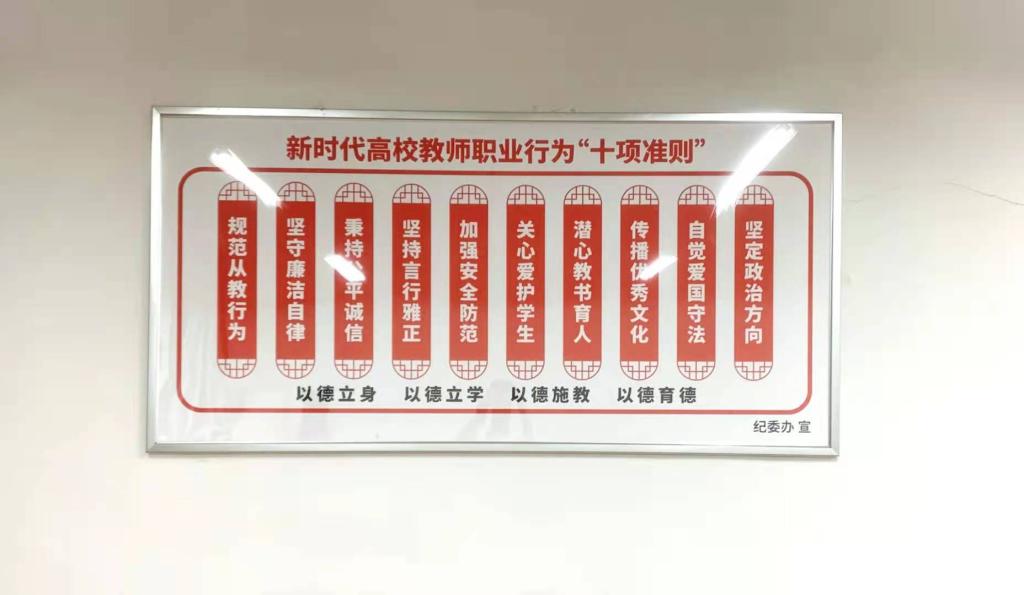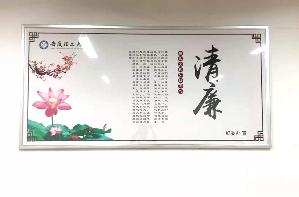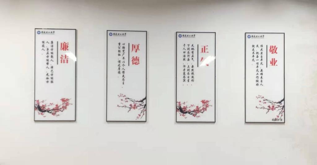 校纪委在学校图书馆二楼大厅、天工南楼、天工北楼、明理南楼、明理北楼教师休息室以及五个户外宣传长廊,打造宣传阵地,展示廉洁文化内容,加强广大教职员工的廉洁教育。宣传内容以中华传统廉洁文化为立足点,突出学校特色,体现时代感和红色文化基因,有积极向上的宣传式口号标语、有党员领导干部廉洁自律规范、有“四有”好老师标准、有新时代高校教师职业行为“十项准则”等;以广大干部、教师、学生为受众点,教育引导干部廉洁从政、教师廉洁从教、学生廉洁修身,传播积极向上的廉洁文化正能量。