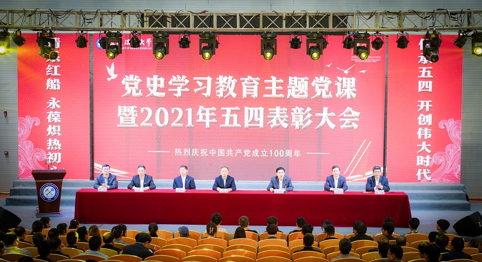 4月29日晚,学校党史学习教育主题党课暨2021年五四表彰大会在舜耕会堂隆重举行。校党委书记郭永存为全体师生讲授主题微党课,校领导虞宝桃、孟祥瑞、吴照明、宫能平、董雨、周旭出席大会并为获奖代表颁奖。大会由校党委副书记、常务副校长虞宝桃主持。