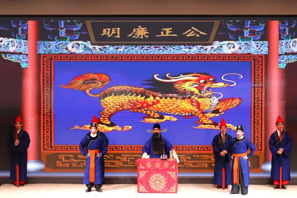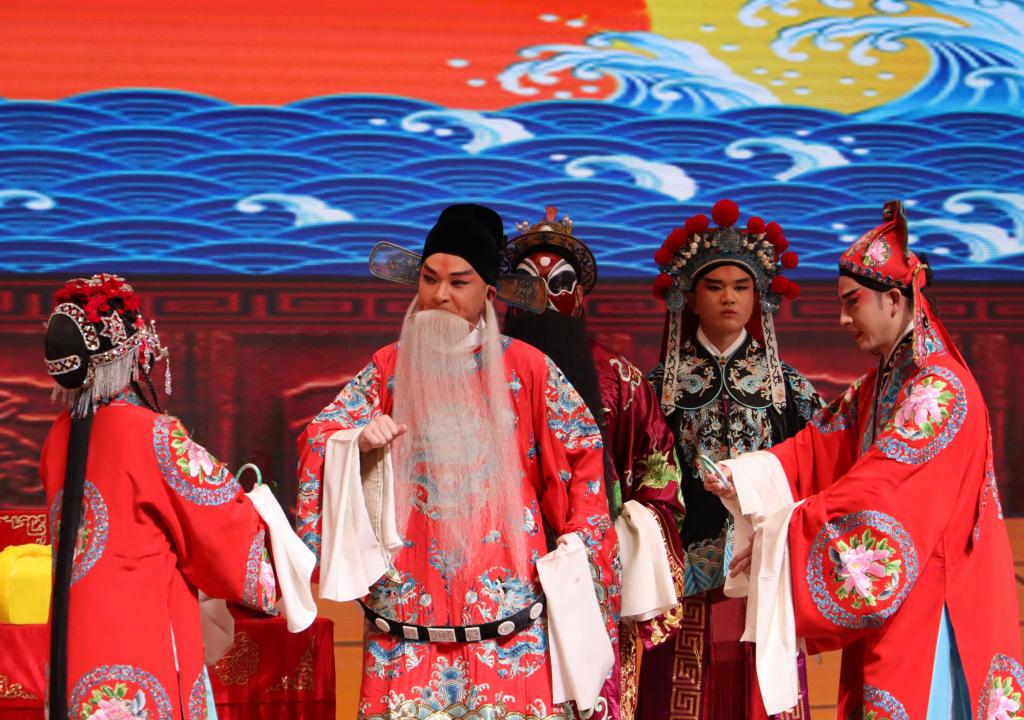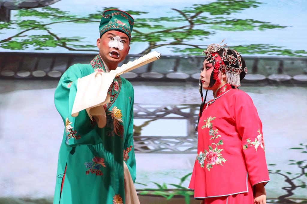 演出中丝竹管弦、皮黄声腔与现场观众的掌声和叫好声交织在一起。来自安徽省徽京剧院的艺术家们精彩上演京剧《诓妻嫁妹》。该剧是一出京剧的骨子老戏,又名《勘玉钏》,故事以一对玉钏的失而复得为线索,牵连出两位女主角俞素秋、韩玉姐截然不同的命运。该剧最大的特色是一人分饰两角,演员前半场饰演青衣俞素秋,后半场饰演花旦韩玉姐。青衣的稳重大方,花旦的活泼俏丽,再加上丑角的插科打诨,整场演出精彩不断,高潮迭起,赢得台下师生的阵阵掌声。