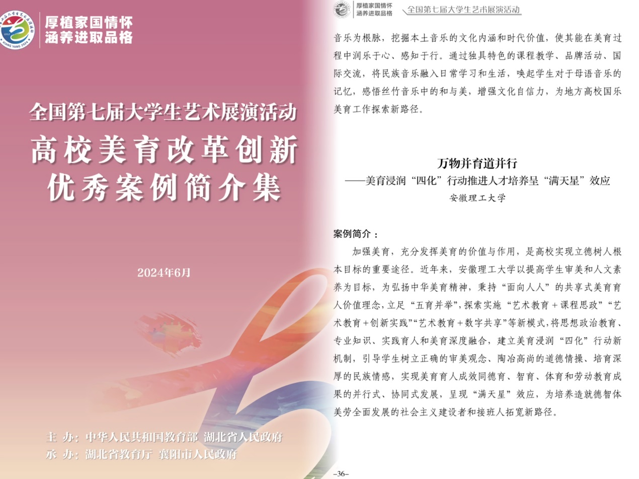 近日,教育部公布了全国第七届大学生艺术展演活动项目评选结果,我校推报的美育改革创新优秀案例《万物并育道并行——美育浸润“四化”行动推进人才培养呈“满天星”效应》获新时代高校美育改革创新案例全国一等奖。