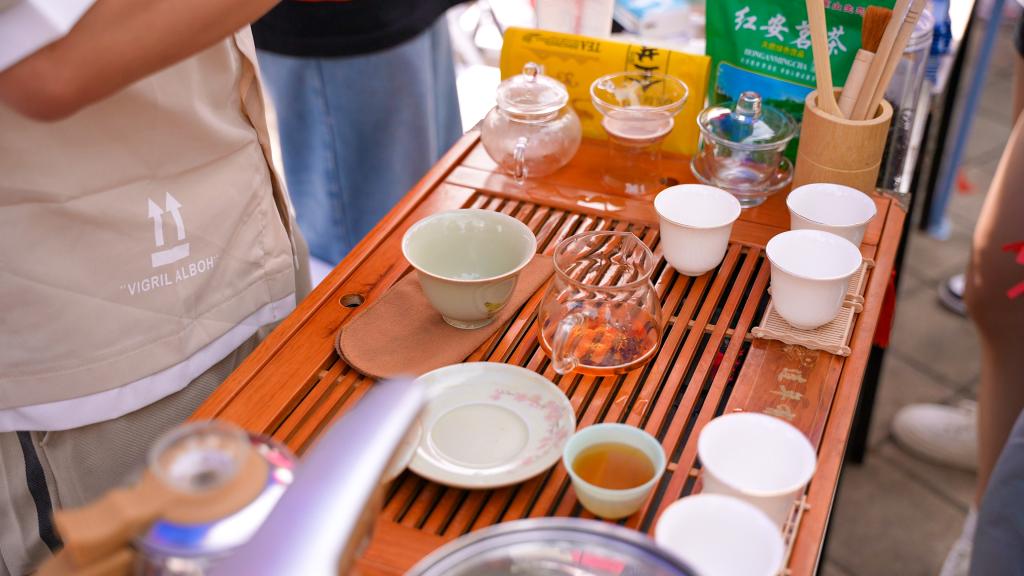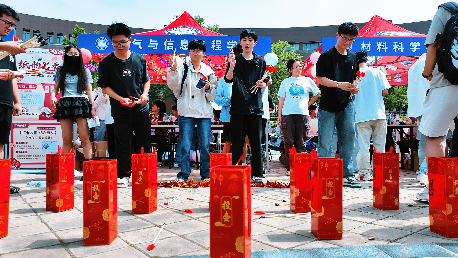 阳光下,“投壶”区人声鼎沸,一个男生跺脚大喊:“哎呀,就差一点!最后这支我一定要投中!”伴随着围观者的加油鼓励,红色的箭矢在空中划出一道优美的弧线落进了壶中,同学们在挑战中亲身体验着“发而不中、反求诸己”的礼仪文化;“茶韵古香”展位前,同学们煮茶、品茶,茶香四溢,让人仿佛穿越千年,与古人共品一盏香茗;成语典故游戏也吸引了众多参与者,每个成语都蕴含传统文化的深厚底蕴,同学们你一言我一语,智慧的火花在欢声笑语中碰撞。