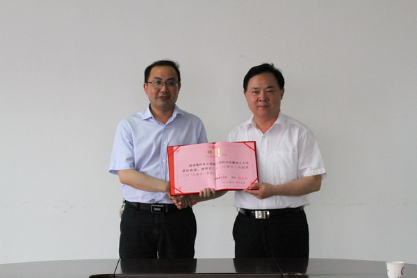 5月30日下午,学校在行政楼14楼会议室举行聘任仪式,聘请淮北矿业集团地质测量处副总工程师董祥林,安徽省测绘局基础测绘信息中心总工程师杨友长,淮南矿业集团资源环境管理部总工程师、副部长沈思良,皖北煤电集团公司总工程师办公室主任、技术中心主任陈玉平受聘为我校兼职教授。副校长刘泽功教授为受聘兼职教授颁发了聘书。