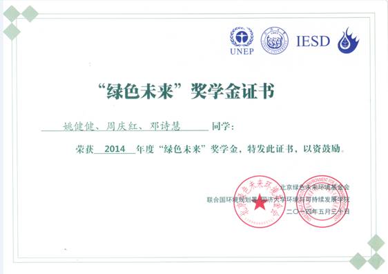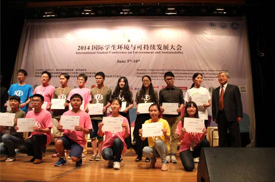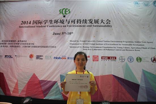 6月5日世界环境日,姚健健代表本团队在上海同济大学,与北大、清华、厦大、同济等名校获奖同学一起出席了联合国环境规划署举办的“2014国际学生环境与可持续发展大会(2014 International Student Conference on Environment and Sustainability”暨“绿色未来奖”颁奖典礼。