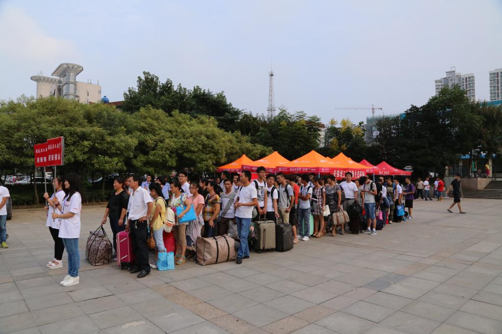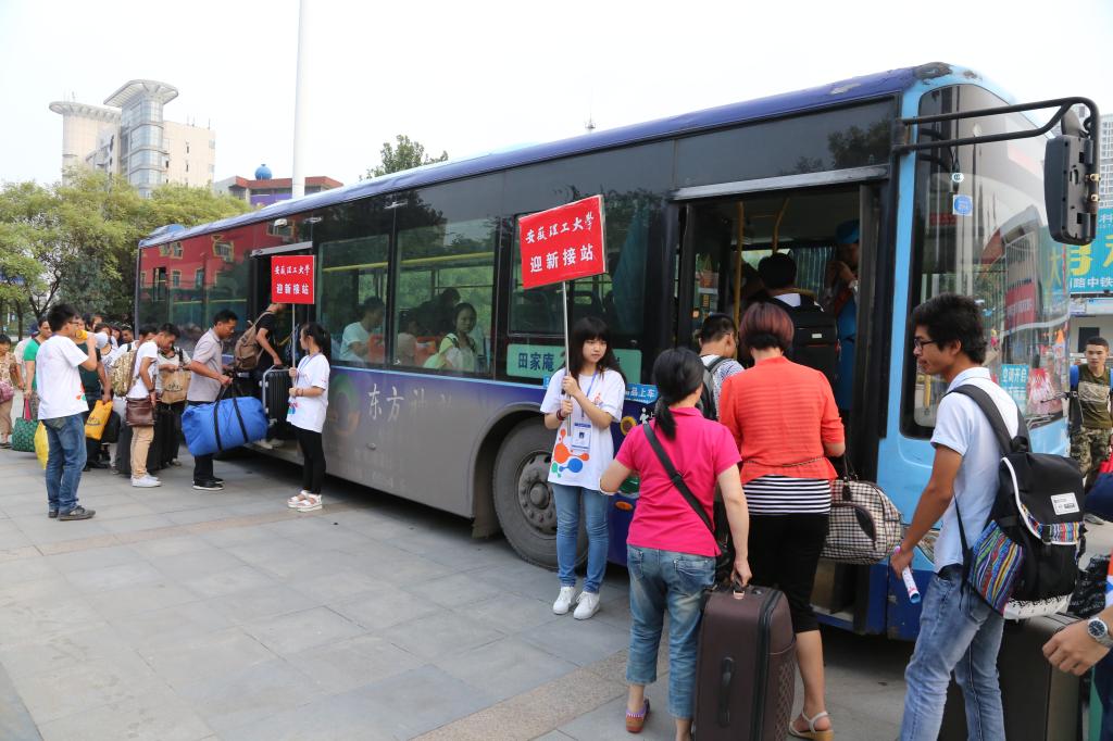 9月10日上午11时,在时阴时晴的初秋雨季中,淮南火车站广场第一批2014级新生及新生家长登上了学校开往北校区的迎新接站车辆,标志着我校2014级新生接站工作正式开始。
