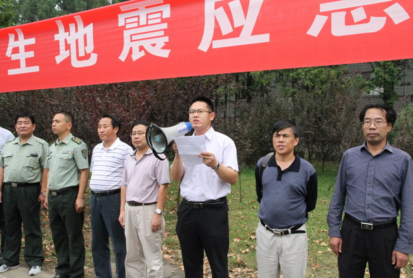 地震应急疏散演练指挥部总指挥、校纪委书记周峰宣布演练开始(摄影:吕祥勇)