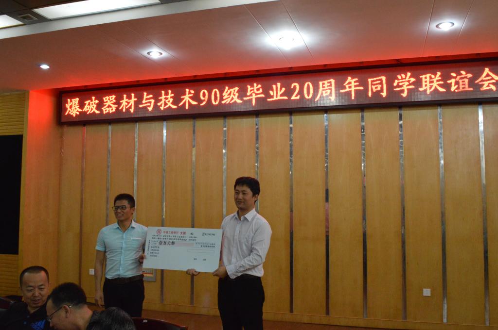 化学工程学院院长何杰代表全院师生对校友们回校考察、交流表示衷心欢迎,并介绍了学院的发展情况和取得的主要成就;代表全体师生对爆破器材与技术90级校友对学院的关心和支持表示真诚的谢意。随后,校友依次发言,他们用朴实的言语表达了本次聚会的激动心情,回顾了当年在学校成长、学习的经历及对母校的感恩之情。最后,校友们向母校捐赠了1.5万元教育资金用于学院发展建设。