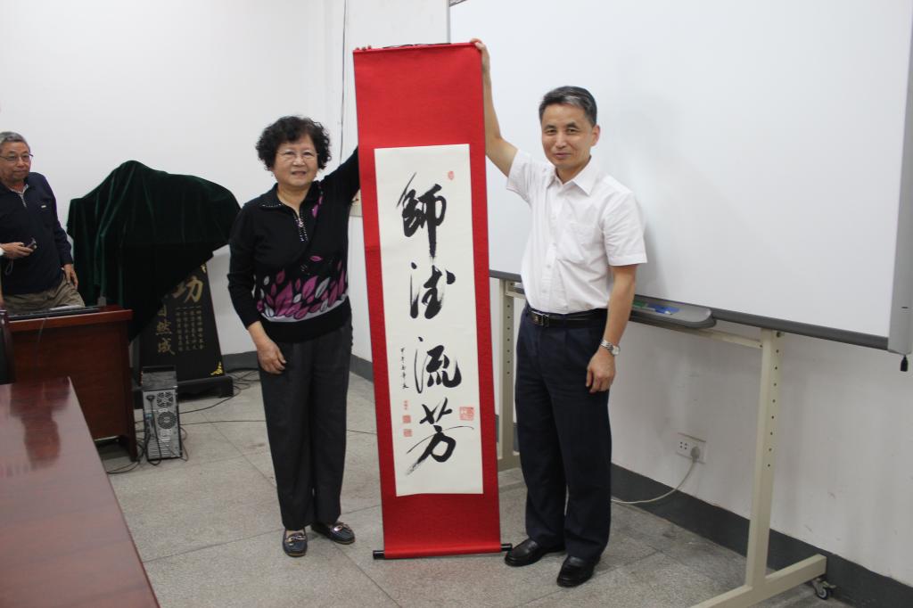 校友们还向母校赠送了书画《师德流芳》和珍藏了50多年的校徽。