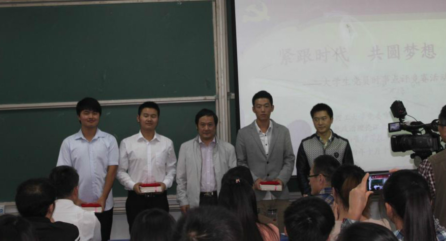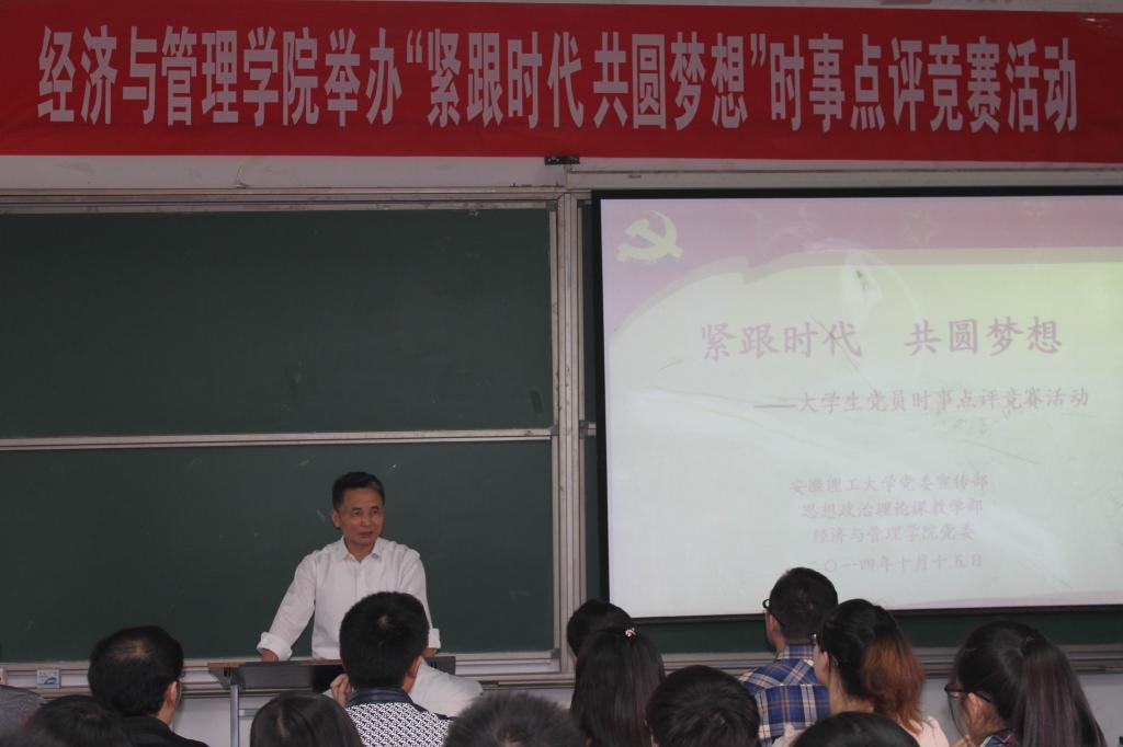 为了进一步培育和践行社会主义核心价值观,认真贯彻学校、学院党委的政治理论学习计划,创新学习方式,提高政治理论学习效果,检验学习质量,在校党委宣传部、组织部的指导下,在思政部的支持下,由校党委宣传部、思政部和经济与管理学院党委共同举办“时事点评”竞赛活动,10月15日下午在经管楼201教室举行,校党委副书记王洪,校党委组织部部长娄志勇、校党委宣传部部长谢振安、思政部副主任孙功和经济与管理学院党政领导参加了活动,活动由院党委书记崔跃武主持。