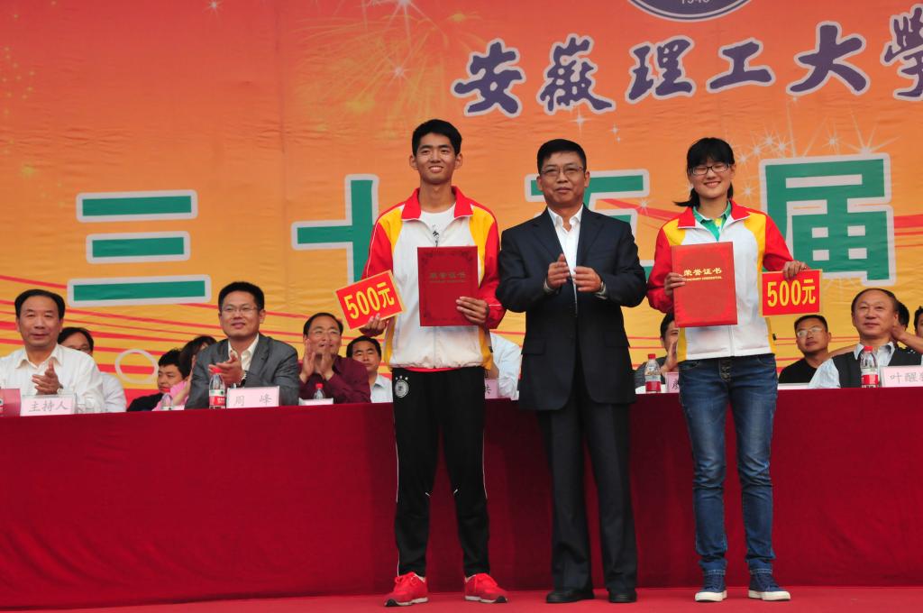 校党委书记颜事龙为打破校记录的学生机械工程学院王健、地球与环境学院李欣芳颁奖。