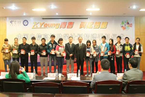 10月30日下午,由教育部、中国电信、中国教育发展基金会共同发起,安徽理工大学和中国电信淮南分公司联合主办的“飞Young青春,翼起梦想”高校助学计划捐赠手机仪式在校本部图西会议室隆重举行。副校长叶醒狮、中国电信淮南分公司副总经理谈骏出席仪式并为获助学生颁赠手机。