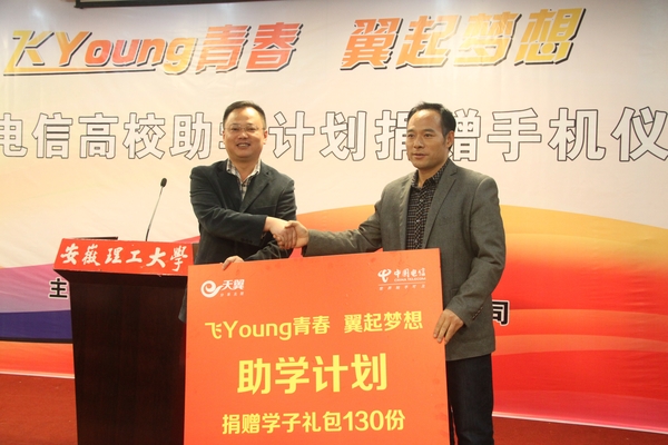 记者了解到,近年来,中国电信持续支持教育信息化建设,提供智慧校园整体解决方案,为教师教学科研以及学生学习生活提供信息化应用服务,有力地支持了国家教育信息化发展。为更好地践行企业使命,履行社会责任,提升企业和品牌正面形象,中国电信集团公司联合教育部、中国教育发展基金会共同发起了2014年“飞Young青春,翼起梦想”高校助学计划。该计划面向全国500所高校的家庭经济困难新生免费提供7万多份、总价值超过6000万元的“学子助学包”,每份“学子助学包”包括一部价值599元的海信大屏智能手机、一张包含200元通信费用(分10个月返还)的飞Young云卡,作为安徽省15所高校之一,我校共有130名2014级家庭经济困难学生获得此项资助。