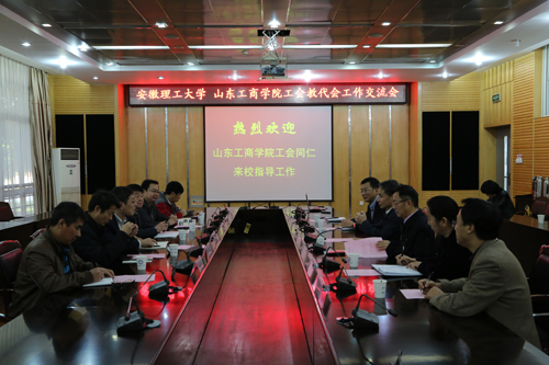 11月4日上午,山东工商学院工会主席范文斌一行6人来校,就教代会、工代会换届工作,职工之家、职工小家建设,女教职工工作等进行调研、交流。校党委副书记王洪亲切会见了来宾并出席两校交流座谈会。会议在新图书馆北会议室召开,由校工会主席洪江如主持。