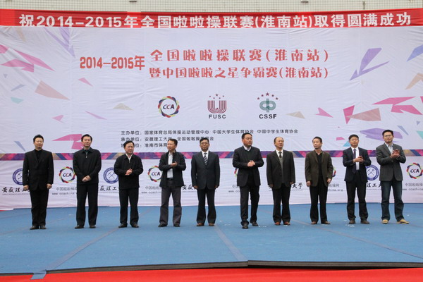 8日下午,2014-2015年全国啦啦联赛(淮南站)暨中国啦啦操之星争霸赛(淮南站)在我校教学楼前广场举行开幕式。校党委书记颜事龙,国家体育总局体操运动管理中心中国体操领队叶振南,淮南市人民政府副市长阮怀楼,我校副校长叶醒狮、刘泽功、孟祥瑞、校纪委书记周峰,淮南师范学院纪委书记周学锋,淮南市体育局局长金昶,全国啦啦操委员会副秘书长李育林,我校学院(部)和相关职能部门负责人出席开幕式并在前排就座。