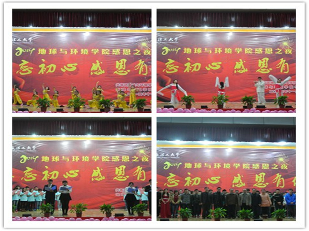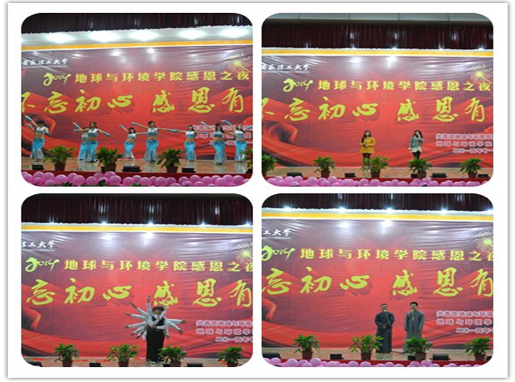 晚会中穿插感恩演讲环节,品学兼优的家庭经济困难大学生舒生茂等同学讲述了自身的励志故事。在场的同学们深受鼓舞,表示不管在生活中还是学习中都要坚定目标,勇敢前行。晚会还通过荧屏展示了地球与环境学院2013-2014年的奖助学金评定情况,激励大学生励志成才,奉献社会。