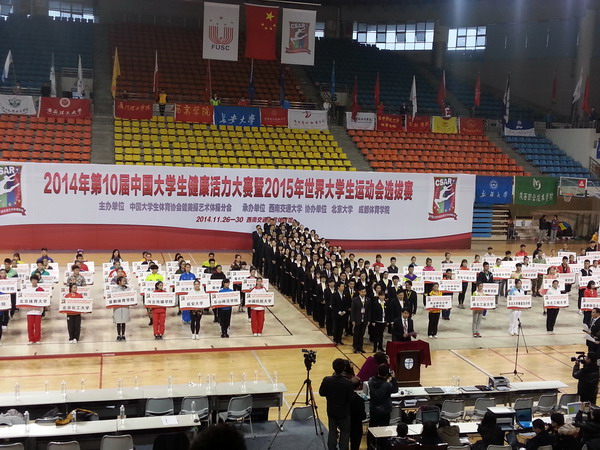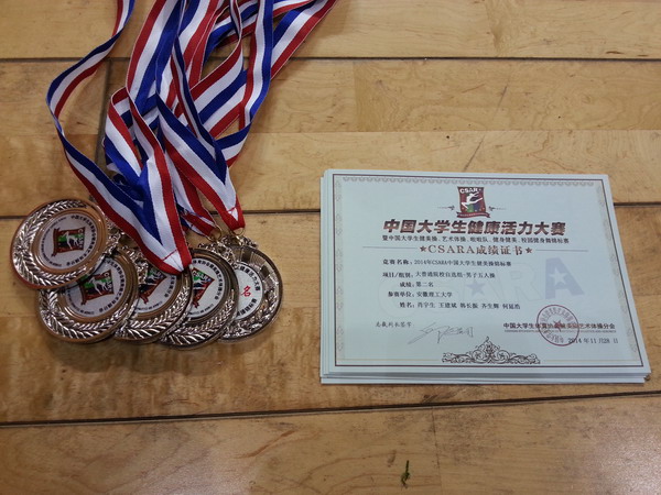 近日,由西南交通大学承办,北京大学、成都体育学院协办的2014年第十届中国大学生健康活力大赛暨2015年世界大学生运动会选拔赛在西南交通大学体育馆落下帷幕。经过3天角逐,我校代表队荣获了大学生普通院校组团体赛和男子五人操两项亚军的好成绩,另有混合双人操获得第四名、男子三人操获得第五名、有氧舞蹈获得第六名、男子单人操获得第八名。