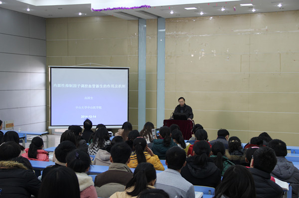 上午,高国全作了题为《内源性抑制因子在肿瘤和糖尿病血管新生中的作用和机制》的学术报告。他系统阐述了血管新生发生机制、内源性新生血管抑制因子、个人课题组人纤溶酶水解片段Kringle 5(K5)/色素上皮衍生因子(PEDF)等研究情况,并与同学们进行了亲切交流,细致解答了同学们提出的问题。