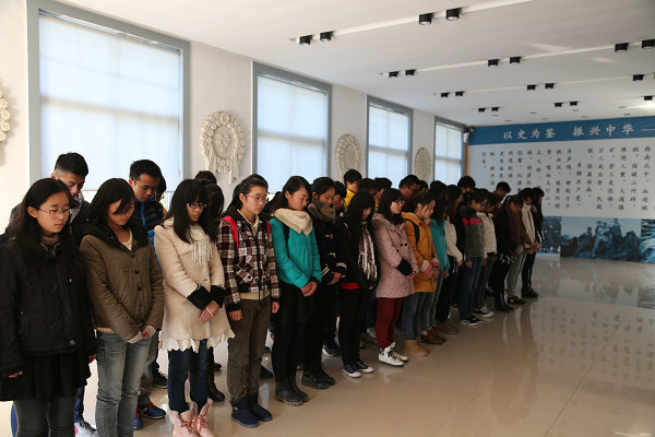 12月13日当天,全校青年师生在校园内外开展了形式多样的国家公祭日主题教育实践活动。能源与安全学院的青年学生上午10点在宿舍准时收看国家公祭的网络视频直播,并在国家公祭网上开展“网络祭英烈”活动,为死难同胞在网上点烛、植树、献花、写祭文,表达哀思。校学生会、校大学生社团联合会、地球与环境学院、机械工程学院、理学院、外国语学院300余名2014级青年马克思主义者培训班的学生骨干不约而同地前往安徽省爱国主义教育基地——大通区万人坑开展教育实践活动,缅怀死难同胞。电气与信息工程学院、能源与安全学院团委在校园里设立宣传站点,宣传国家设立公祭日的目的和意义,开展“勿忘国耻、振兴中华”签名活动,吸引了2000余名青年学生参与。外国语学院、理学院团委为学生党员、入党积极分子举办了“勿忘国耻,圆梦中国”主题讲座,通过PPT、视频等生动的教育方式,激励他们勇于担当、成才报国。机械工程学院、化学工程学院、人文社会科学学院的班级团支部相继召开了“勿忘历史,珍爱和平”的主题班会,集体默哀缅怀,共谈理想信念。机械工程学院、化学工程学院团委还举办了爱国主义征文比赛和演讲比赛,用文字和语言铭记历史,悼念逝者。机械工程学院、理学院、外国语学院、材料科学与工程学院团委组织学生骨干集中学习了“习近平总书记在南京大屠杀死难者国家公祭仪式上的讲话”,观看了《1937南京》、《南京!南京!》等影片,进一步增强当代青年学生的社会责任感、国家荣辱感和民族使命感。