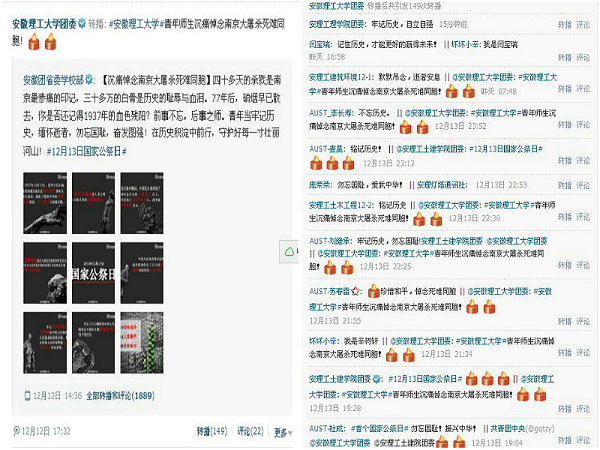 各级团学组织利用微博开展“国家公祭日 学子知与行”线上活动