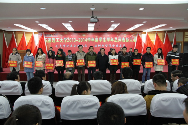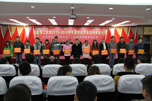 表彰大会在庄严的国歌声中拉开帷幕。校长郭永存发表了热情洋溢的讲话,向取得优异成绩的同学们表示祝贺,向精心培育学生的老师们致以衷心感谢,向长期关心和支持学校发展的社会各界致以崇高敬意!他指出,近年来,在同学和教职工的共同努力下,学校各项事业快速发展,成功跨入省部共建高校行列,进入安徽省地方特色高水平大学建设序列,学校的人才培养、科学研究、服务社会及文化传承等方面成果丰硕,新校区建设工程全面开工,预计明年一个功能齐全、环境优美的现代化校园将全面建成。他勉励同学们在荣誉面前不自满、不松懈,好好把握住当前的学习机会,正确对待生活中遇到的各种压力,化压力为动力,保持定力、持续给力,站在新的起点上,用拼搏续写辉煌,不断取得新的成绩。
