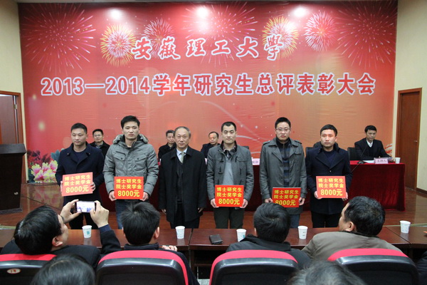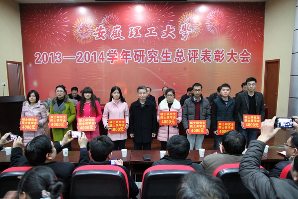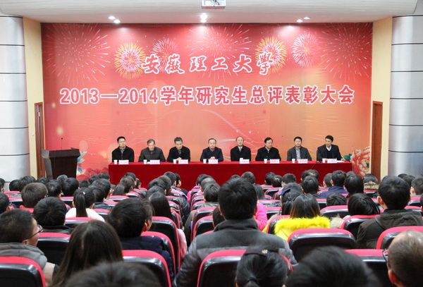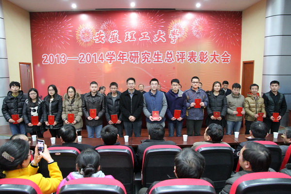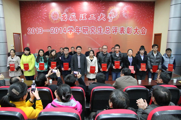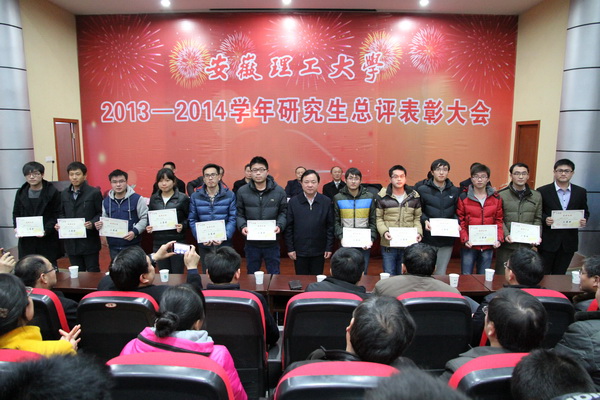 12月29日下午,安徽理工大学2013-2014学年研究生总评表彰大会在校本部六角楼报告厅隆重举行。校领导郭永存、叶醒狮、王洪、刘泽功、王其东、孟祥瑞、周峰出席表彰大会,并为获奖的先进个人颁奖。大会由校党政办主任郑为超主持。