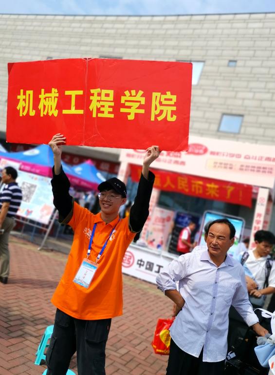 志愿者高举引导牌欢迎新生(摄影:崔琴)