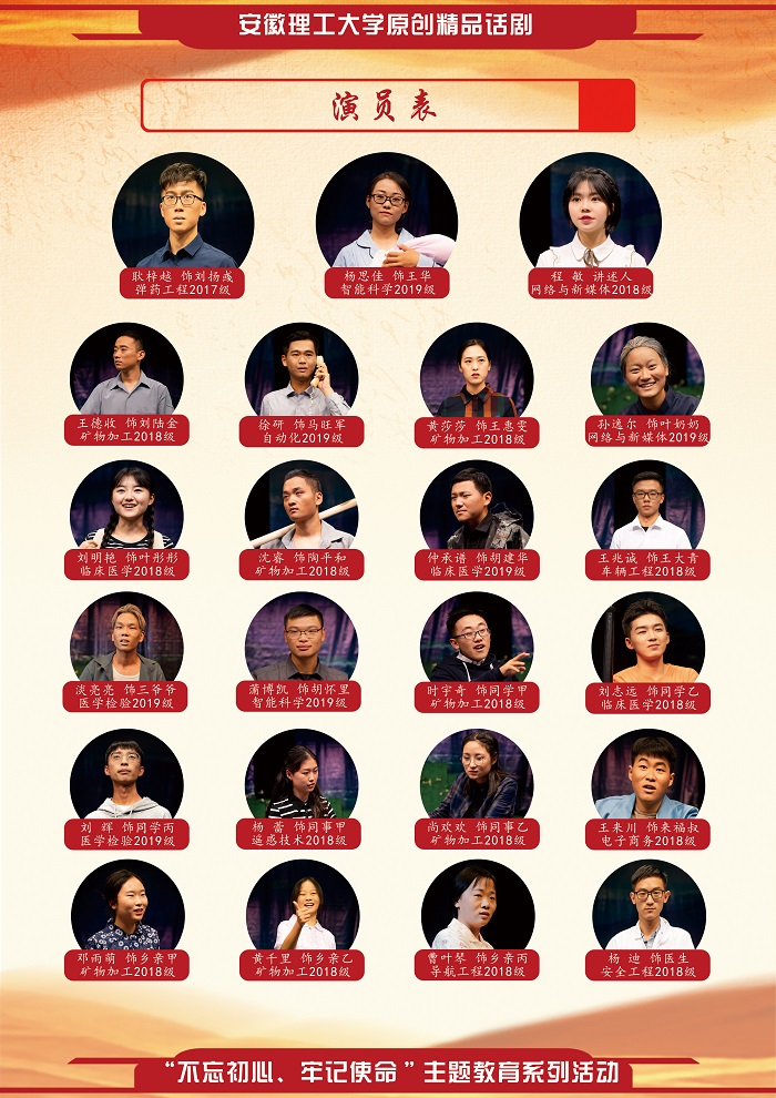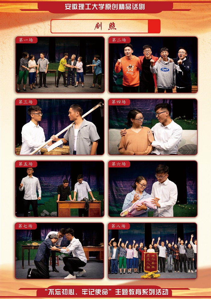 话剧《冶溪河》以我校优秀校友、安徽省优秀扶贫干部,牺牲在脱贫攻坚一线的基层干部刘扬彧同志为创作原型,讲述了在故事发生地——安徽省岳西县冶溪镇千年流淌的冶溪河畔刘扬彧同志扶贫助困的感人故事。全剧共8场戏,在原有真实故事的基础上戏剧性地讲述了刘扬彧入学、工作、扶贫直至牺牲的先进事迹,深刻地描述了农村精准扶贫现状,生动地塑造了一名对党忠诚、一心为民、勇于担当的扶贫干部形象,讴歌了新时代脱贫攻坚中的奉献和大爱精神。