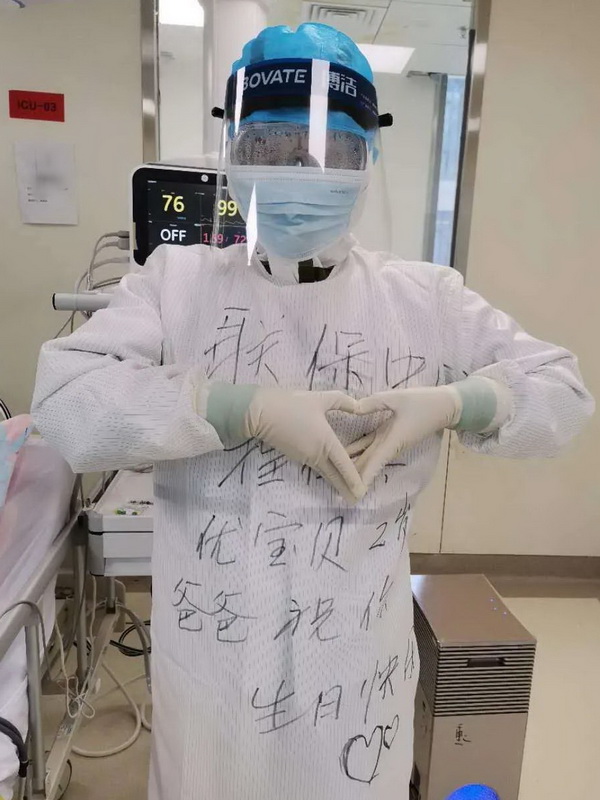 3月5日,是程仁洪医生出战泰康同济医院的第21天了,也是他的小女儿优优的生日,这天他特意在防护服上写上“优宝贝2岁了,爸爸祝你生日快乐!”的字样,等到处理完所有危重患者,并与接班医生交接清楚以后,在临下班前特意让科室同事帮忙给自己拍些照片,录个生日祝福视频给女儿当生日礼物。他说,他想看看把自己变成“大白”的样子给女儿唱生日歌,女儿还能不能认出他?在这个特殊的监护病房里给女儿留一段视频,将会是女儿成长过程中收到的最有意义的一个生日礼物。