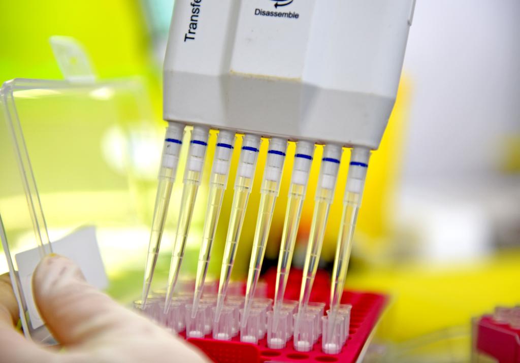 安徽理工大学第一附属医院PCR实验室内,检验人员在生物安全柜里将待检样本加入核酸提取试剂盒。