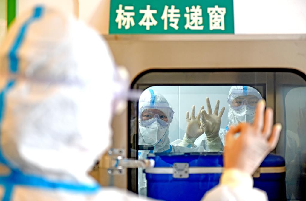 安徽理工大学第一附属医院PCR实验室内,医务人员将核酸采集样本通过传递窗送进检测区。