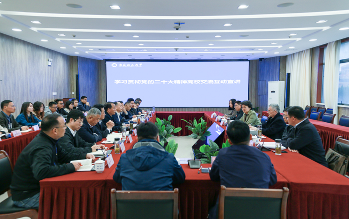 根据省委统一部署,11月13日下午,省委宣讲团来校宣讲党的二十大精神。省委宣讲团成员、省发改委党组书记、主任陈军同我校师生进行面对面、互动式座谈宣讲。校党委书记郭永存参加座谈并主持会议。市委常委、市委宣传部部长邬平川,省发改委政研室主任张云,市委宣传部副部长唐剑,市发改委主任陈涛,省委讲师团李筱白陪同交流。