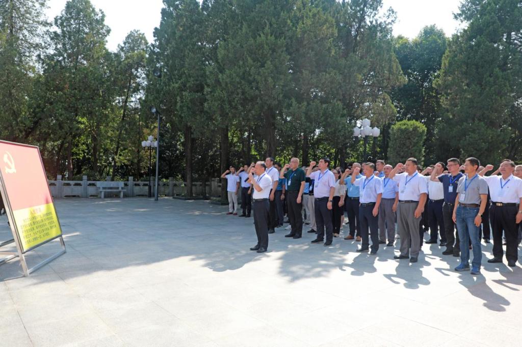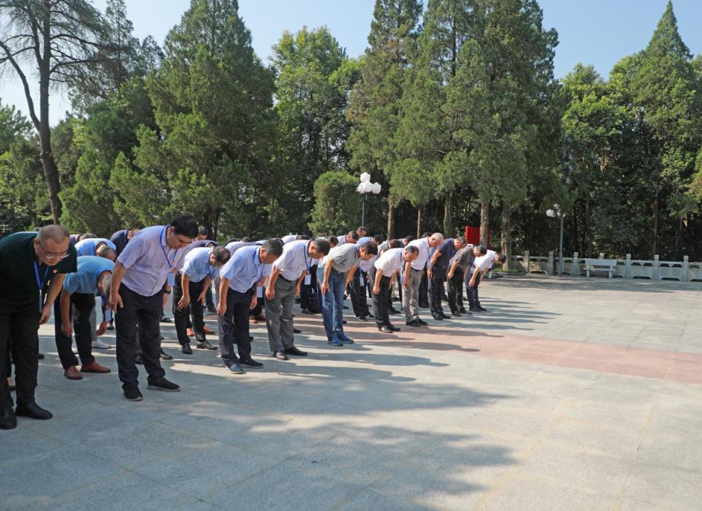 实景党课环节,培训班全体学员来到金寨县革命烈士陵园。庄严、肃穆的革命烈士纪念碑就位于安徽省金寨县中心区域的革命烈士陵园。陵园内,松柏苍翠挺拔,通往烈士纪念碑的台阶一尘不染,厚实的花岗岩像一列列士兵整齐有序,引领瞻仰的人们一步步拾阶而上,重走先烈们的长征路,回首烽火硝烟里的感动。 2016年4月,习近平总书记亲临安徽视察指导,第一站就来到金寨祭奠英灵、缅怀先烈,并亲笔题词:“一寸山河一寸血,一抔热土一抔魂。回想过去的烽火岁月,金寨人民以大无畏的牺牲精神,为中国革命事业建立了彪炳史册的功勋,我们要沿着革命前辈的足迹继续前行,把红色江山世世代代传下去。”先烈们为共和国立下的功勋值得我们后人永远敬仰和铭记!在金寨红军广场,全体学员拾级而上,步行至革命烈士纪念碑正前方肃立,举行向革命烈士纪念碑敬献花篮仪式。工作人员缓缓抬起花篮,正步来到革命烈士纪念碑前,将花篮安放在纪念碑基座上。郭永存缓步走上前去,悉心整理花篮缎带。全体同志深深三鞠躬,表达对革命烈士的深切缅怀和无限敬仰。在革命烈士纪念碑下,全体党员面对着鲜艳的党旗,在郭永存的带领下重温入党誓词。铿锵激扬的誓词声在红军广场久久回荡,体现出大家赓续红色血脉,不忘立德树人初心,牢记为党育人、为国育才使命的坚定信念。