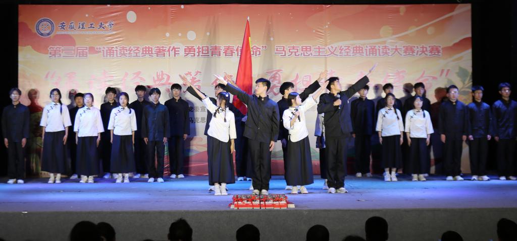 此次比赛在本学期开设《马克思主义基本原理》的2023级本科生中展开,学生以行政班级为单位参赛,经过初赛、复赛的历练和打磨,共15组队伍脱颖而出,成功入围决赛。从马克思的《青年在选择职业时的考虑》《关于费尔巴哈的提纲》,到马克思恩格斯的《共产党宣言》,到恩格斯的《在马克思墓前的讲话》到列宁的《欧仁鲍狄埃》,再到毛泽东的《星星之火可以燎原》《为人民服务》《纪念白求恩》,最后到习近平的《在纪念马克思诞辰200周年大会的讲话》,一部部经典著作的经典论述喷涌而出,同学们将真挚饱满的情感融入到内涵丰富、韵味悠远的马克思主义经典中,展示出对经典作品的深刻理解和独特诠释,充分彰显了安理学子激情迸发的青春风采与奋发有为的精神面貌。