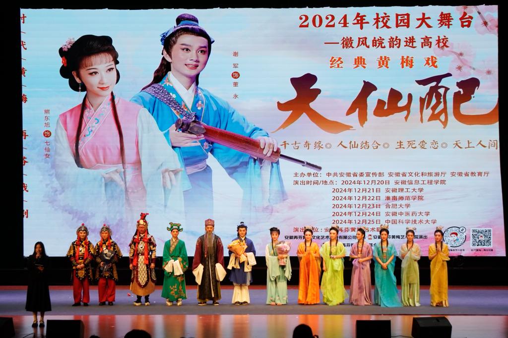 12月21日下午,由安徽省委宣传部、省教育厅、省文旅厅联合主办,再芬黄梅艺术剧院承办的2024年“校园大舞台——徽风皖韵进高校”黄梅戏《天仙配》在大学生创新创业会议中心上演,全校1000余名师生共同走进戏曲世界,感受传统文化魅力。