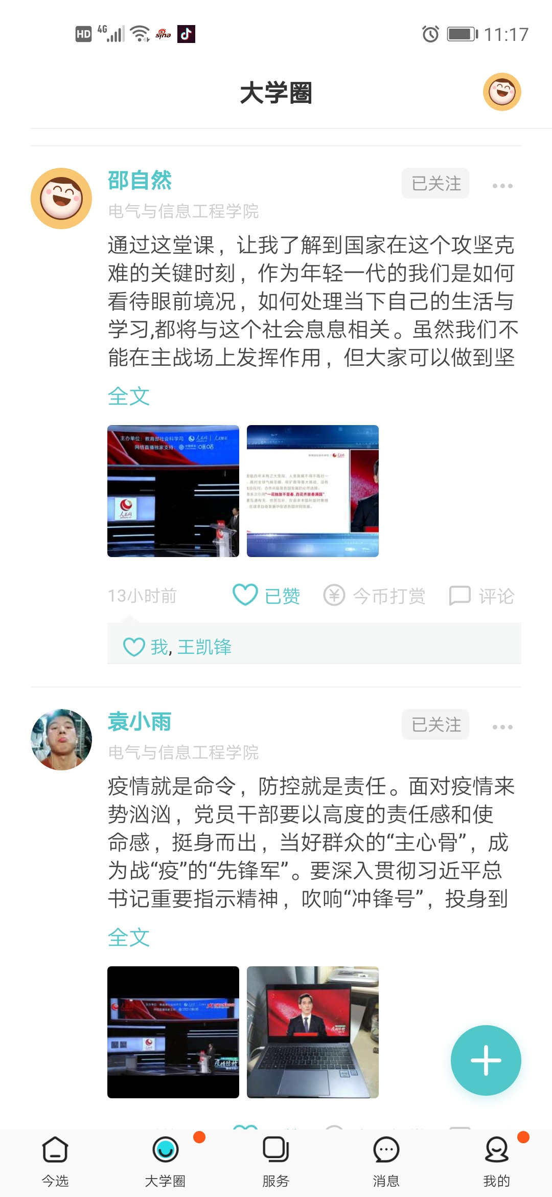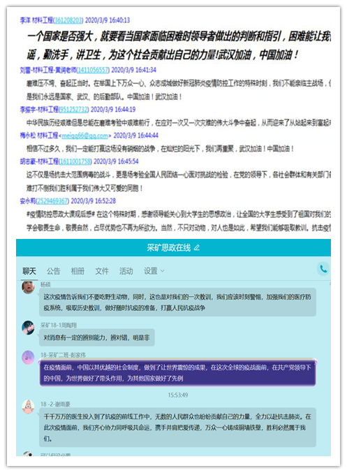 思政课后,我校师生通过班级微信群、今日校园等平台,围绕“这堂思政课哪位教授的观点让你印象最深?”“新冠肺炎疫情给我们哪些反思?”“中国抗疫如何彰显了中国共产党的领导和中国特色社会主义制度显著优势?”“作为当代大学生,你如何为国家和人民贡献力量?”等议题踊跃交流,畅言所感。