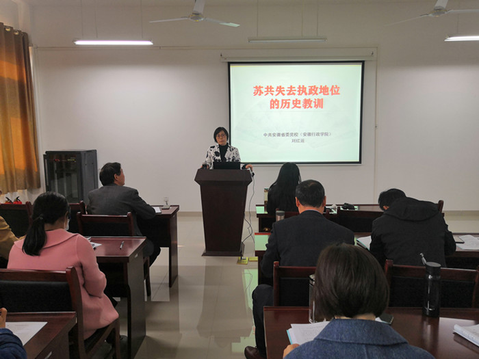 11月20日下午,中共安徽省委党校(安徽行政学院)刘红运副教授应邀做客“百川大讲堂”,在崇智楼411报告厅作了题为“苏共失去执政地位的历史教训”的专题辅导报告。报告会由院党总支书记、院长孙功主持,马克思主义学院、数学与大数据学院的教师党员聆听了报告。