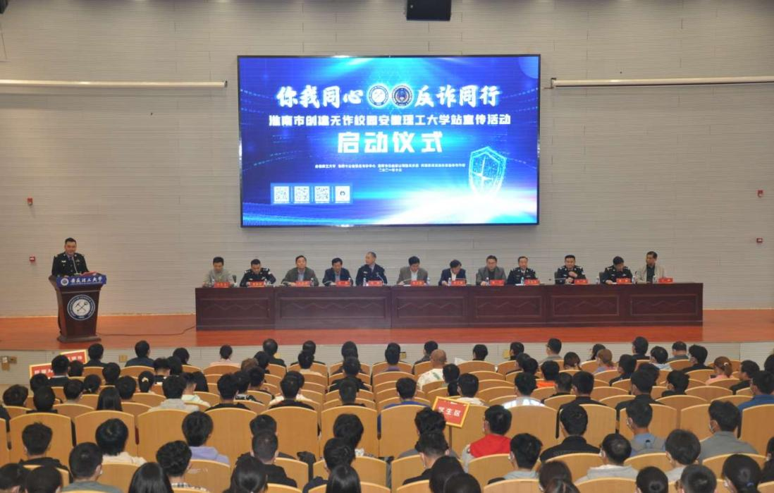 本次活动由市公安局反诈中心、市公安局山南分局、阿里巴巴本地生活安全与合作部和安徽理工大学联合主办,淮南日报社、淮南市人民广播电视台、淮南市新媒体协会、淮南抖音短视频培训基地以及学校17个学院党委副书记、保卫负责人、师生代表等400余人参加活动。