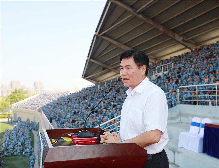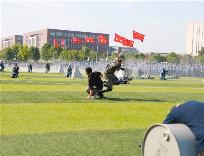 虞宝桃和同学们分享了他对学校“团结 奋进 博学 奉献”校训的理解。他指出,学校校训是为人为学、做人做事、追求真理与服务社会的完美统一,反映了学校的办学理念和治校精神,既具有鲜明的时代特色,又具有深厚的文化内涵。团结就是力量,团结深刻体现着中华民族“和”的精神,习近平总书记提出构建人类命运共同体,是人类大同的团结思想,无论是旧中国反抗外来侵略还是孟晚舟得以返回祖国,都是中华民族团结一致抗争取得,我们要有团队的精神,我们的班级要团结,我们的学院要团结,我们的学校发展更要我们团结;奋进就是要奋勇前进,《周易》有云:天行健,君子以自强不息。自强不息就是奋进的表现。我们的同学们在军训当中严格按照安排认真组织训练,各连队更是形成了“比、学、赶、帮、超”浓厚氛围,创先争优,相互促进,刻苦训练,顽强拼搏,这就是一种奋进的表现。希望同学们在大学生活当中一直会勇往直前,奋发图强。博学就是《礼记·中庸》中的“博学之,审问之,慎思之,明辨之,笃行之”。 大学的根本任务是立德树人,同学们既要树立自己优良的德行还要立志拥有广博而精深的学问。要树立远大理想抱负,用扎实的学识,为党和国家,为学校的事业发展添砖加瓦;贡献是社会责任感,强调要把我们个人的奋斗与社会的发展紧密相连,这样才是有价值的人,有益于祖国和人民的人。我们当代大学生,应当摒弃佛系和“躺平”的观念,真诚的学习和付出,为国家服务,为人民服务,为社会服务,这才是我们应有的价值理念。希望同学们能够长期坚持军训时期坚韧不拔的意志、吃苦耐劳的品质、团结协作的精神和严格的组织纪律观念,以平常心去迎接各种挑战和困难,奋力书写属于自己的青春篇章。