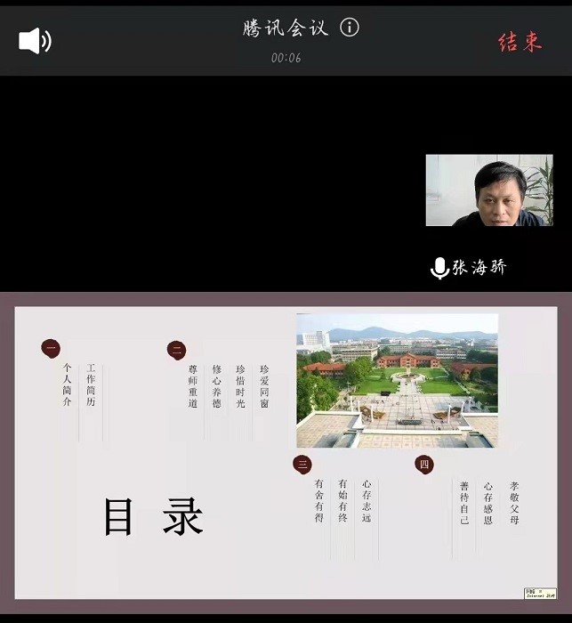 张海骄以《感恩》为主题,以自身的生活阅历和工作经历为主线,讲述了大学和工作期间其本人的发展历程,指出同学们身为一名在校大学生应当尊师重道、修心养德、珍惜时光、珍爱同窗,作为一名憧憬未来的有志青年需要心存志远、有始有终、学会取舍,作为社会、家庭的一分子更应善待自己、感恩他人、孝敬父母,保持一颗感恩的心,鼓励同学们要学好专业知识,树立远大理想,不负韶华,不负时代,在实现中华民族伟大复兴的时代洪流中踔厉奋发、勇毅前进。