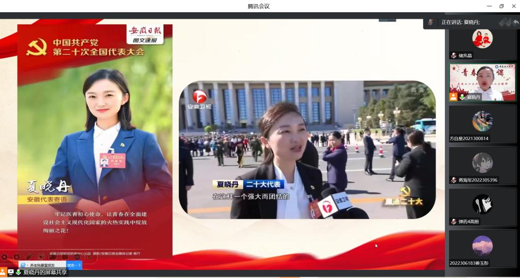12月29日,由校团委主办,材料科学与工程学院承办的第九季青春思政课精彩开讲。本次课程以“走进二十大代表,感悟二十大精神”为主题,邀请到党的二十大代表、校第一附属医院日间医疗管理中心副主任、护士长夏晓丹为访谈嘉宾,全校800余名师生通过腾讯会议平台参加了活动。