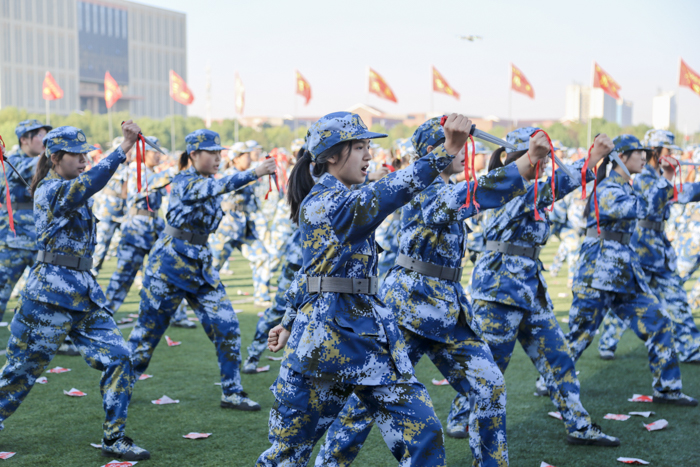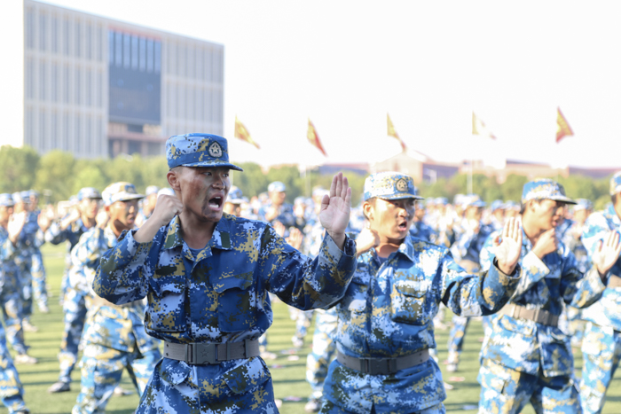 伴随着雄壮的阅兵进行曲,20个军训团方阵在国旗、校旗方队的引领下,迈着矫健的步伐,喊着嘹亮的口号,依次通过主席台接受检阅,展示军训刻苦训练取得的骄人成果。同学们目光坚毅、英姿飒爽,充分展现了新时代安理人的团结奋进、自信阳刚,展示了“青春有为,强国有我”的坚定信念。随后的军体拳、匕首操、格斗术等表演,刚劲有力、威武英气,诠释了安理学子刚健勇毅的热血青春;韵律操表演,活力四射、朝气蓬勃,展现了安理学子昂扬向上的精神风貌;大合唱《歌唱祖国》,声振林木、响遏行云,唱出了安理学子浓厚挚烈的爱国情怀。