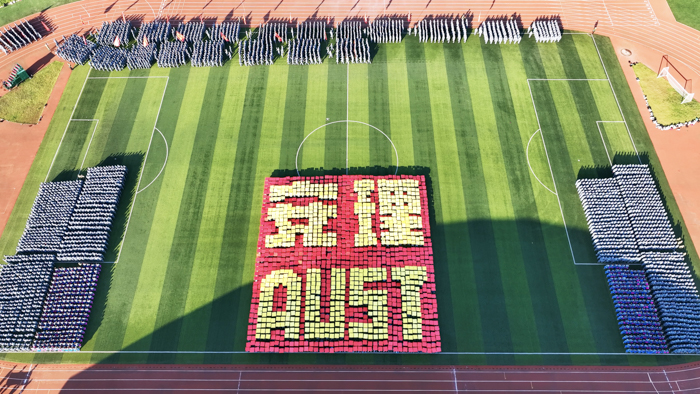 随着学生方阵摆出“10、9、8、7……”数字倒计时字样,军训汇报表演正式开始。花样操方阵摆出“校徽”“安理”“1945-2023”“78”“团结、奋进、博学、奉献”“砥砺新时代、创建双一流”“党徽”“中国地图”等字样和图案,抒发了2023级新生对党和国家以及学校的热爱之情,表达了对学校创建“双一流”的最真挚期许和祝福。