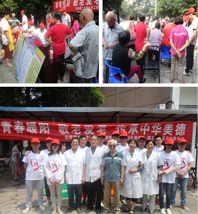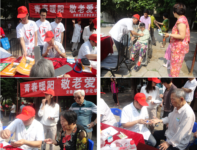 6月4日上午,化学工程学院联合理工大社区居委会、理工大社区卫生服务站在本部家属区举行了以“青春暖阳,敬老爱老”为主题的免费为社区老人测血糖血压等健康服务活动。田家庵区卫生局党组书记张晓光、朝阳街道社区卫生服务中心主任卢斌、朝阳街道社区卫生服务站站长张萍、理工大社区居委会主任刘守则、学院关工会副主任汪大立、学院团委书记曹秀军及暖阳爱老团10余位成员参加活动。